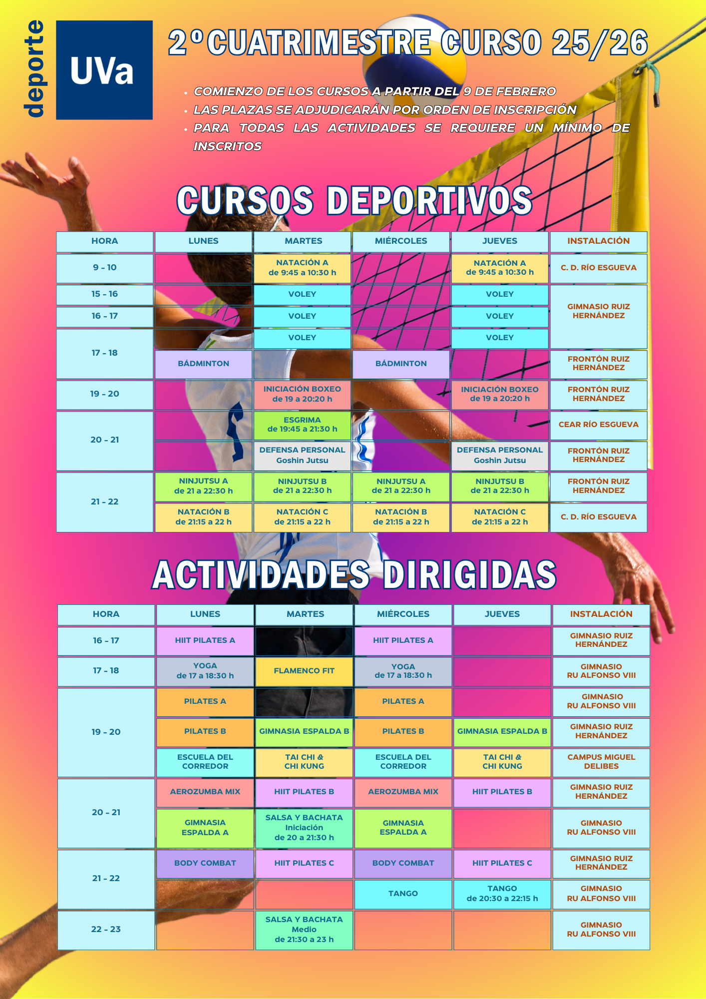 - Para cualquier consulta sobre tu inscripción ponte en contacto con el Servicio de Deportes enviando un correo a servicio.deportes@uva.es